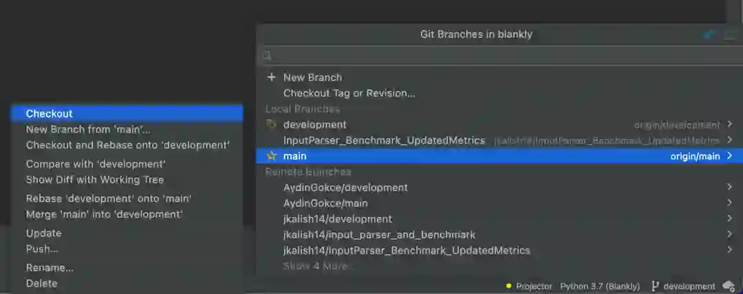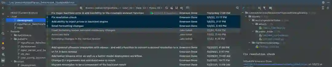 在全面切换到 JetBrains 之后,我几乎没有碰过我的终端命令行。JetBrains 提供了包括提交、冲突解决、分支切换和分支对比等在内的源码管理等整体功能。从我的体验来看,JetBrains 在源代码控制上比 VS Code 的要好得多。下面我罗列一些使用体验的截图: