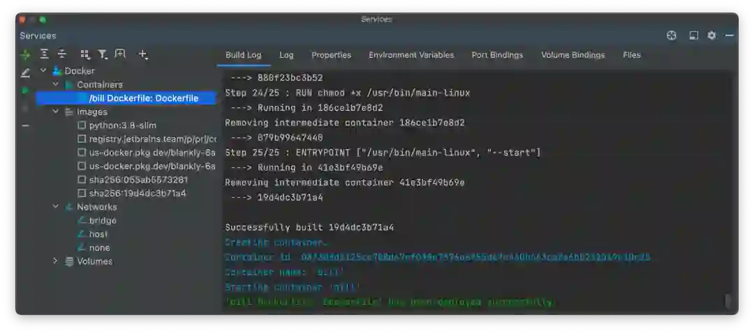 例如,JetBrains 针对 docker 提供了强大内置支撑。仅通过指定一个诸如 Dockerfile 的配置类型文件,所有的 JetBrains 的 IDE 都会通过一个易用的 GUI 提供对所有参数、名称、标签、端口以及环境变量的完整控制。在运行的时候,IDE 通过集成 docker,为你提供 docker 的构建日志、运行日志、环境变量以及可视化的集成配置信息: