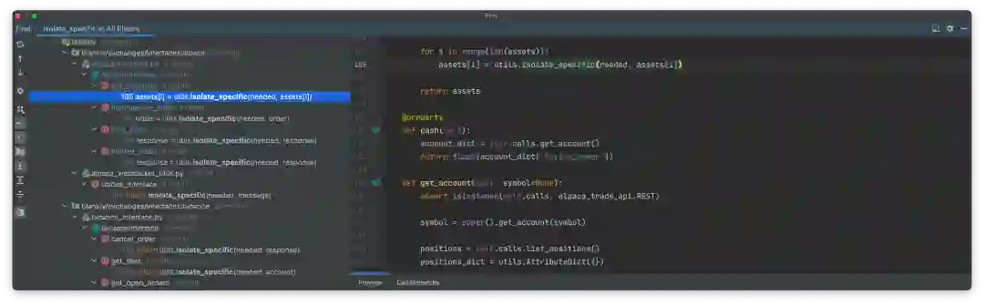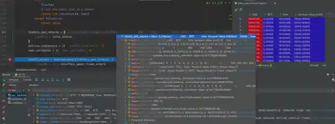 如上面截图所示,底部的窗口中显示了作用域内的全部值。history_and_returns 的下拉菜单中显示了字典对象的所有属性值以及嵌套在该字典对象中的数据帧。右边的面板中,则和 SciView 一样,显示了已经嵌套在字典中的数据帧。在不设置任何打印语句或堆栈跟踪的情况下,就能如此深入了解代码,对于开发人员来说是非常有用的。试想一下,当所有变量的赋值都被编辑器显示在其旁边时,我们可以很容易找到循环中的逻辑错误、修复因为索引导致的故障甚至做一些更加深入的逻辑推理。