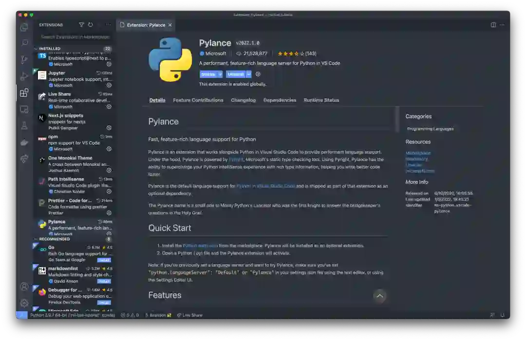 VS Code 是最具扩展性的编辑器之一,而且集成能力和可扩展性是它的核心功能。在众多扩展能力中,Python 扩展、远程开发扩展以及一些智能感知驱动的扩展是目前最热门的。此外,VS Code 也有一些很酷的功能,例如通过 Prettier 进行代码格式化,通过图标和代码编辑器主题进行主题定制等。VS Code 提供的每个事项或功能特性都是完全可扩展的,同时扩展的本身也可能是增强扩展能力的过程。