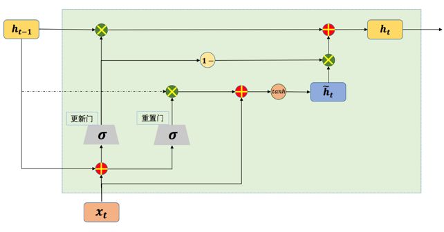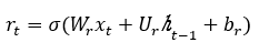 重置门的作用是决定当前时刻的候选状态是否需要依赖上一时刻的网络状态以及需要依赖多少。从图5可以看到,上一时刻的网络状态先和重置门的输出相乘之后,再作为参数用于计算当前时刻的候选状态。重置门的计算公式如下: