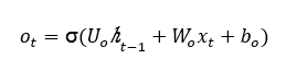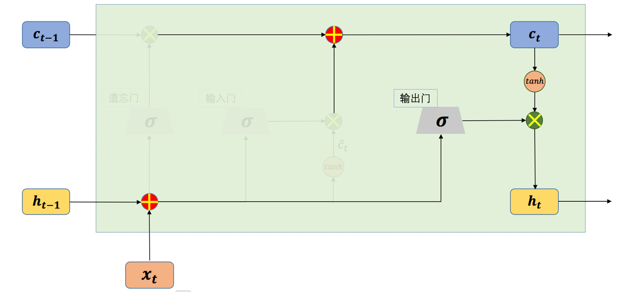 和输入门是同样的方法,通过的值来控制上一时刻的内部状态有多少信息需要“遗忘”。当的值越趋近于0,被遗忘的信息越多。同样的原理,我们来看“输出门”,如图4所示。输出门的计算公式如下: