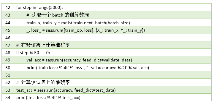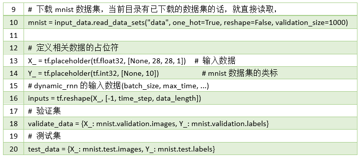 第10行代码用来加载mnist数据集,并通过参数“validation_size”指定了验证集的大小。第16行代码用来将mnist数据集的格式转换成“dynamic_rnn”函数接受的数据格式“[batch_size, max_time,data_length]”。