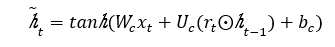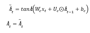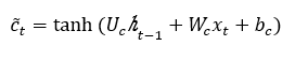 上式中,参数的下标“c”代表这是“tanh”节点的参数,同理,输入门参数的下标为“i”,输出门参数的下标为“o”,遗忘门参数的下标为“f”。上式与简单结构循环神经网络中隐藏层的计算公式一样。在LSTM中,我们将“tanh”节点的输出称为候选状态。