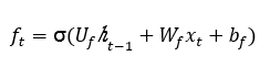 LSTM中也有类似于RNN(这里特指前面介绍过的简单结构的循环神经网络)的前向计算过程,如图2,如果去掉输入门部分,剩下的部分其实就是RNN中输入层到隐藏层的结构,“tanh”可以看作是隐藏层的激活函数,从“tanh”节点输出的值为: