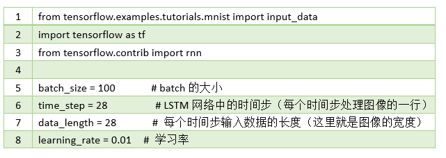 我们首先导入需要的包,然后定义了神经网络中的一些相关参数。其中第6行代码定义了LSTM中的时间步的长度,由于我们mnist数据集的图像大小为28X28,所以我们将一行像素作为一个输入,这样我们就需要有28个时间步。第7行代码定义了每个时间步输入数据的长度(每个时间步的输入是一个向量),即一行像素的长度。