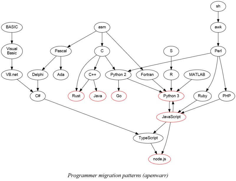 我绘制了一个主流编程语言的变迁图,用以表示程序员在不同语言之间的切换路径。