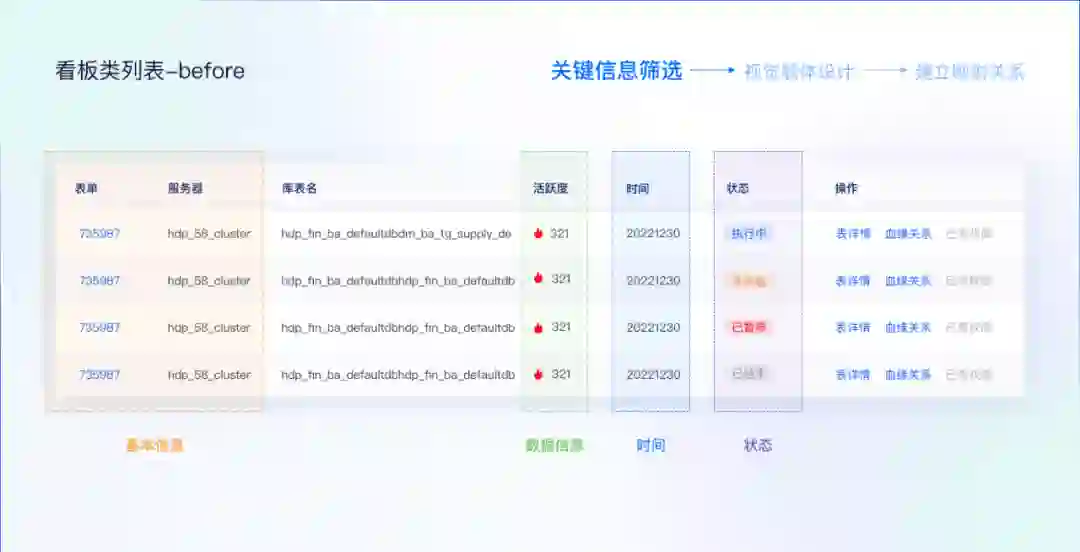 信息列表不清晰是中台最常见的问题之一,传统的列表无非是字段的堆叠,大量相似信息的重复出现,降低了有效信息的捕获和整合效率,加重了认知负荷。