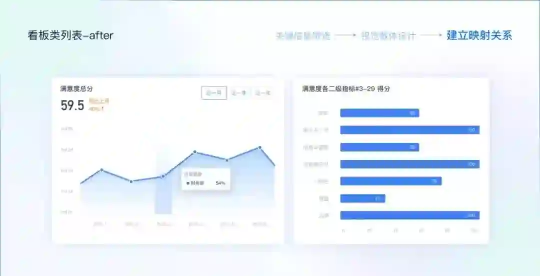 以体验驾驶舱项目为例,它是58UXD携手ADS打造的一款基于体验维度的一站式体验数据监测平台,具备数据监测、数据看板、指标预警等核心能力。其中数据看板类的信息层级可以拆分为三部分:关键信息筛选、视觉载体设计、视觉映射关系。