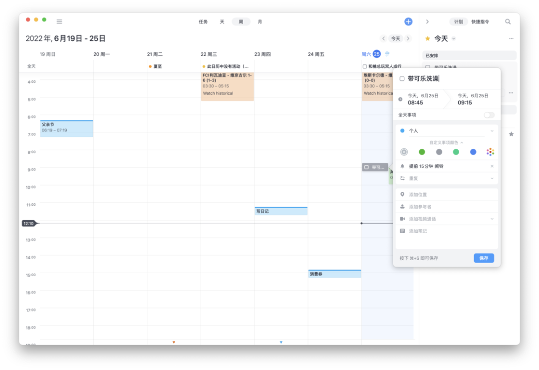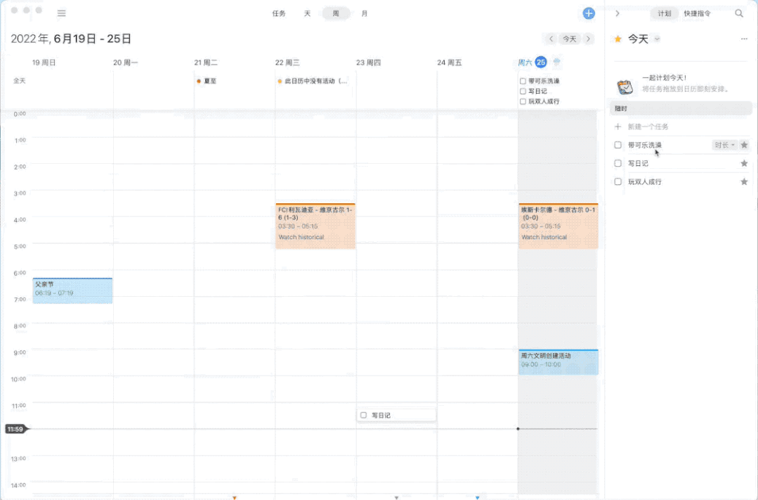 Calendars 可以导入 6 种第三方服务的日历事件以及待办任务,而通过计划功能我们可以非常方便地将日历事件和待办任务进行结合,在时间线上统一管理和安排。不管是在列表、日视图、周视图还是月视图中,只需从右侧的面板中把待办任务拖进日历中即可。