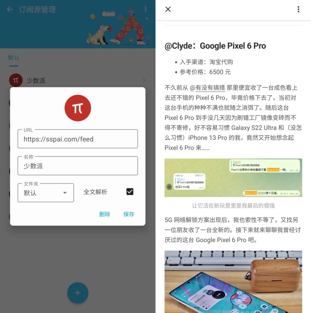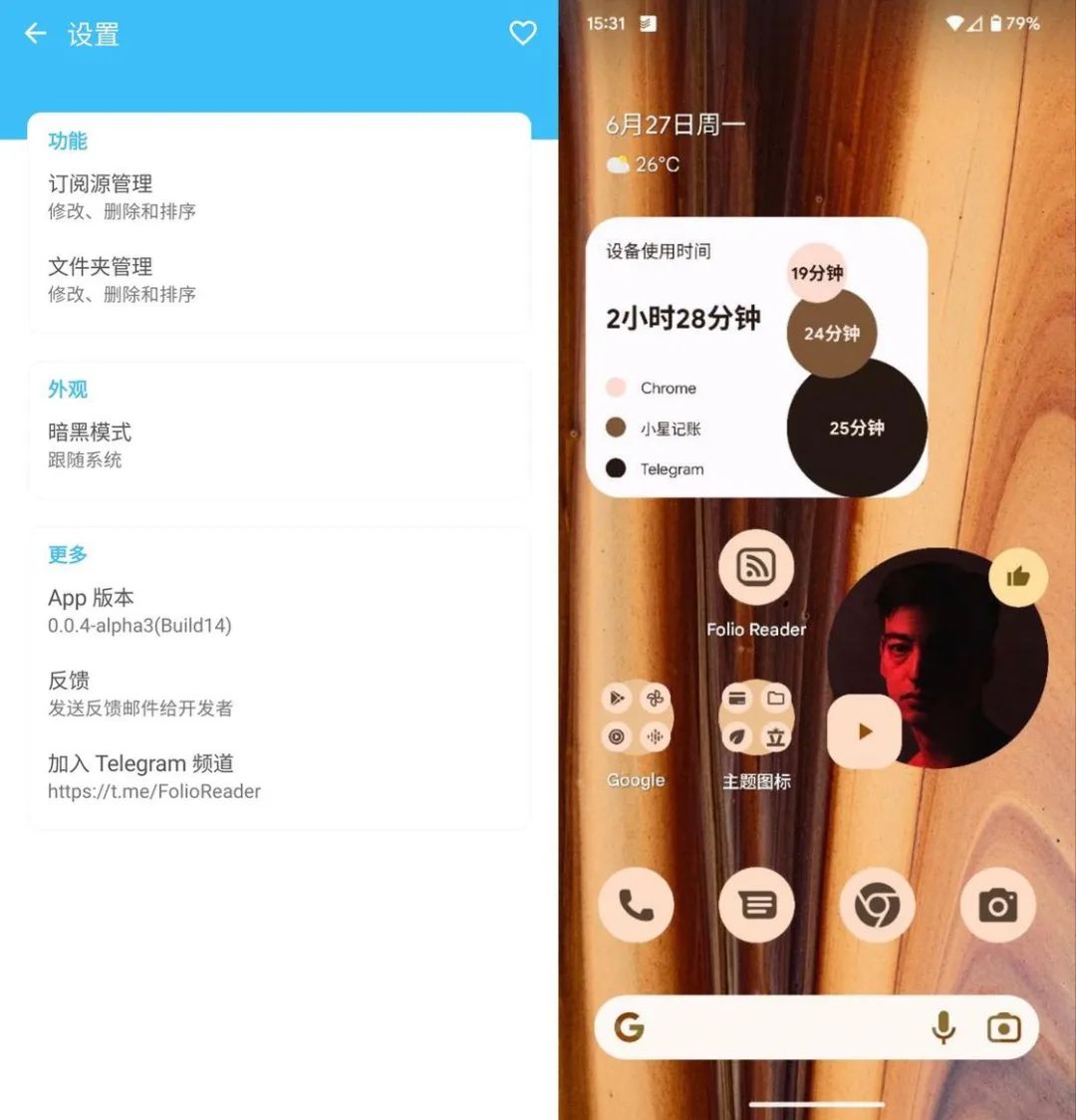除此之外,Folio Reader 也支持文件夹分组功能,方便用户整理订阅源。值得一提的是,Folio Reader 不仅提供了自动夜间模式,还已经支持了「动态主题图标」功能(如果能完全适配 Material You 就更好了),作为一款尚未满周岁的新产品来说,Folio Reader 确实足够细致了。