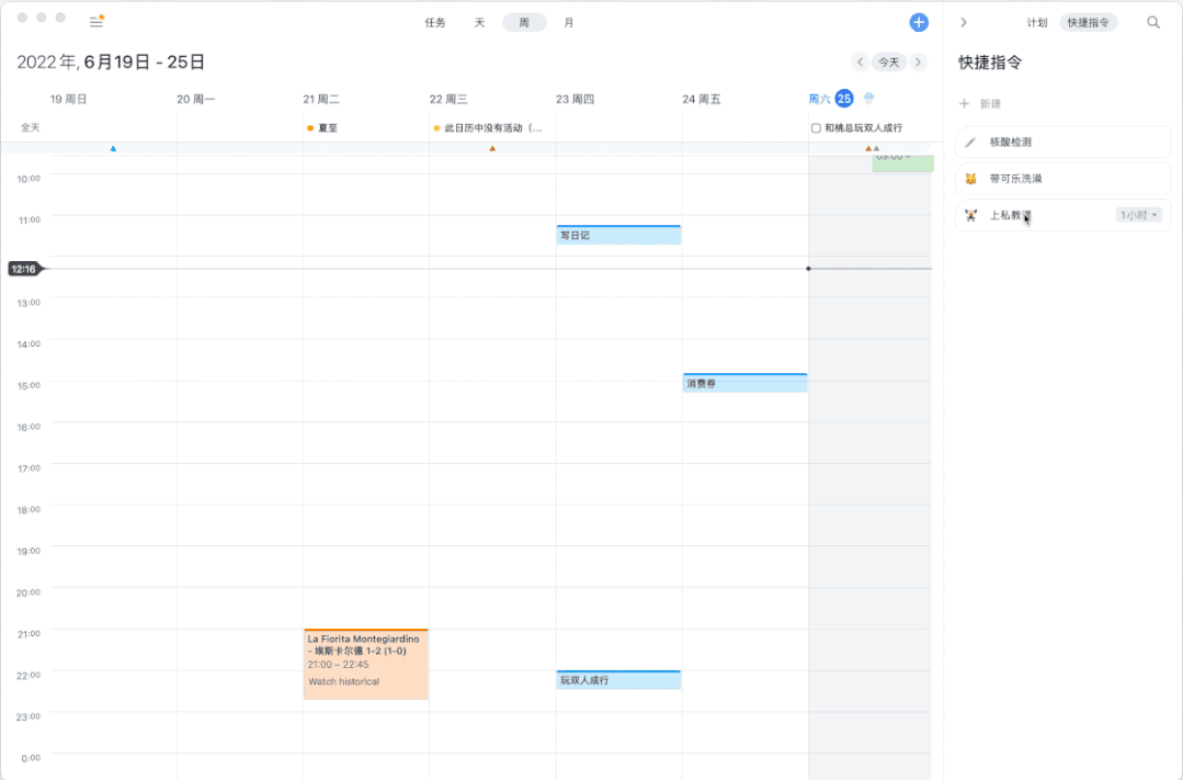 在计划功能的同一个面板中,还有另外一个功能——快捷捷径,此快捷指令非彼快捷指令,可以理解为 Calendars 中预设好内容和持续时间的事项模版,只需拖到日历中就可以快速创建。类似的功能我在记账 App 中看到过,但在日历 App 中还是首次见到。