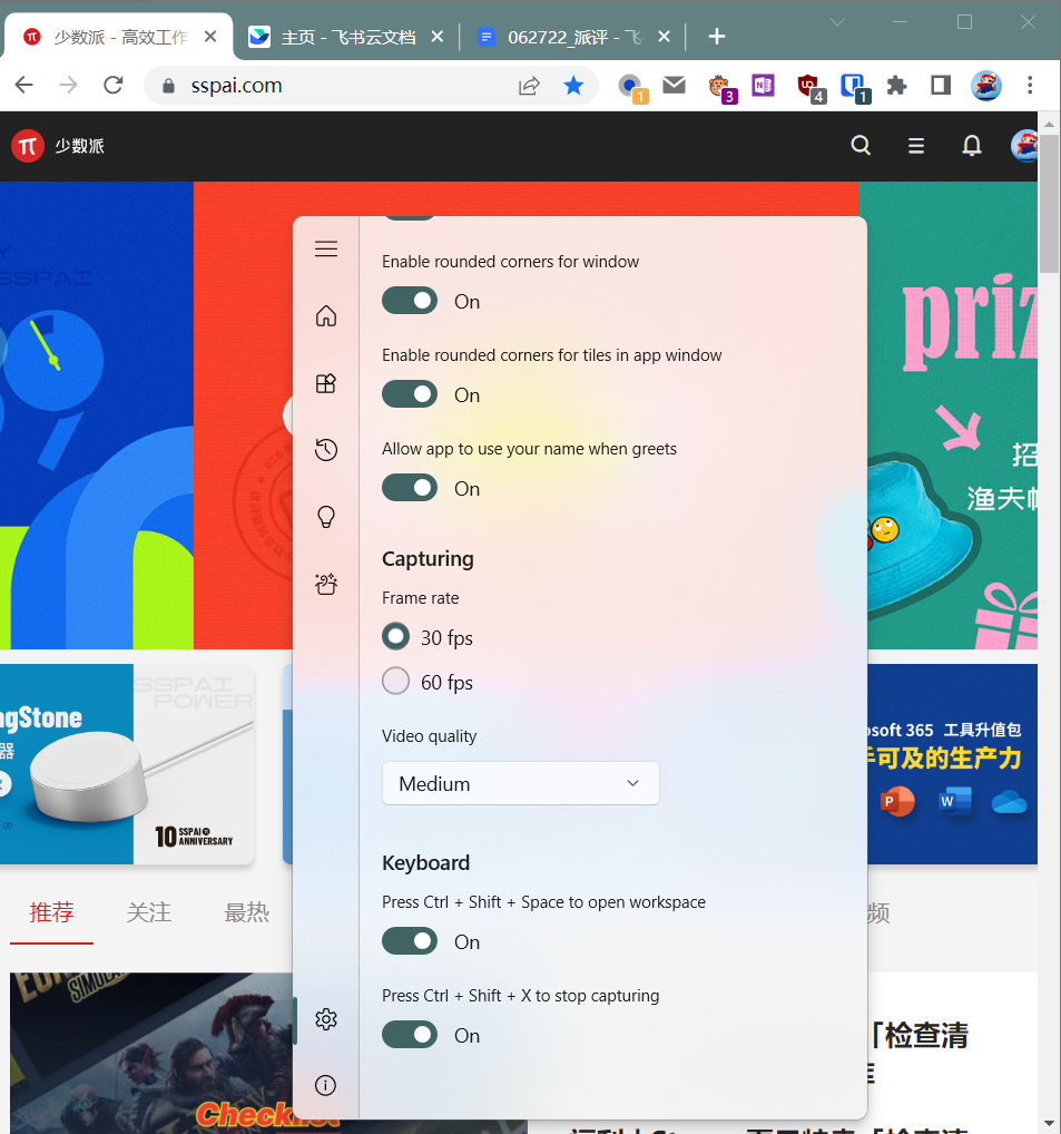 想要添加快捷方式,只需要在侧边栏切换到「All apps」标签并「pin」一下就好。需要注意的是,这里默认只展示 UWP 应用,你可以点击加号来添加其他软件工具。主页下方则是一些系统内建操作的快捷方式,比如我就最喜欢 emoji 键盘这个快捷操作,因为在没有外接键盘使用电脑时,虚拟键盘查找 emoji 表情也要点击好多次。设置中还可以对一些快捷操作进行自定义,例如录制窗口的帧率等等。