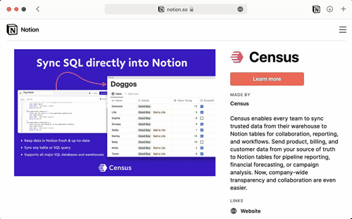除了可视化的数据呈现之外,利用 Notion 的开放 API,我们甚至可以将其作为工作空间的直接数据来源,从而实现数据源层面的完全打通,比如说我们可以利用 Census 这个反向 ETL 工具来将可行数据同步到 Notion 中、通过 Bardeen.ai 构建一个在 Notion 中设置重复工作流的自动化工具,以及通过 Rootly 自动向 Notion 发送各种事件报告。