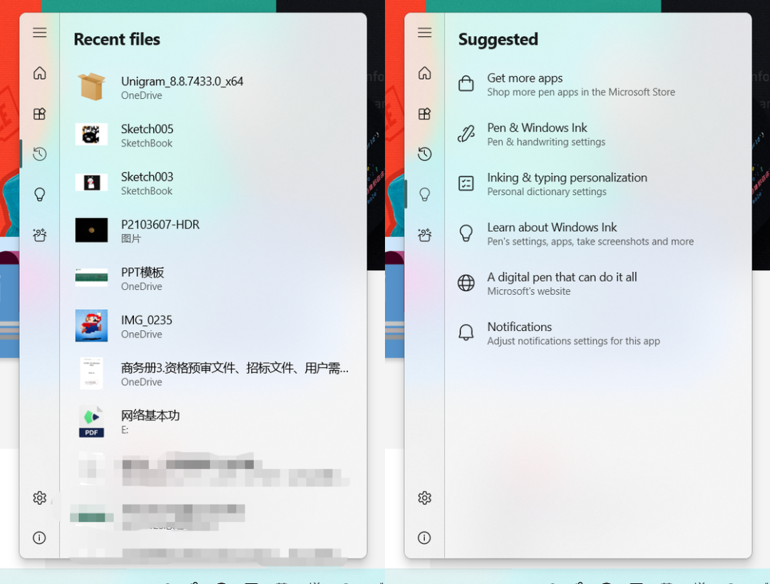 Ink Workspace 还支持最近文件查看,它基本上与开始菜单中的最近文件功能相同,但 Ink Workspace 对于缩略图的支持比较完善,开始菜单中不能够显示缩略图的图片、PPT、PDF,它都能显示出来。这可比微软的产品力强得多。
