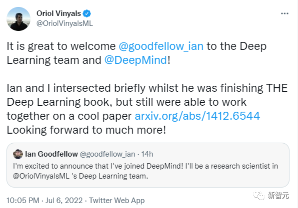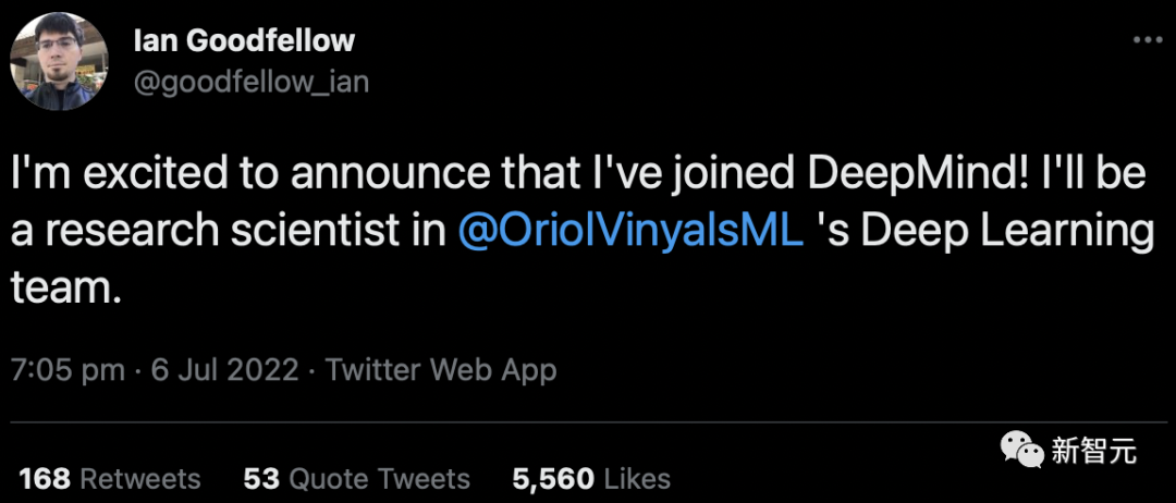 7月6日,Ian Goodfellow在推特上宣布正式加入DeepMind,并将成为Oriol Vinyals深度学习团队的一名研究科学家。