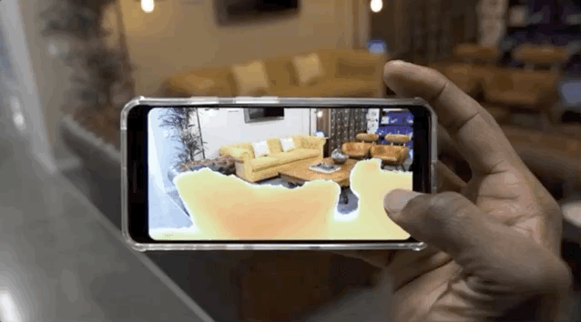 以下是Houzz应用程序的gif样本图片,客户可以在将其作为现实对象放置之前虚拟放置家具并对其进行可视化。在此,此人在他想要保留桌子的区域轻拍,然后移动相机以各种不同的角度对其进行可视化。我们看到桌子没有与ARCore深度API所附带的椅子重叠。