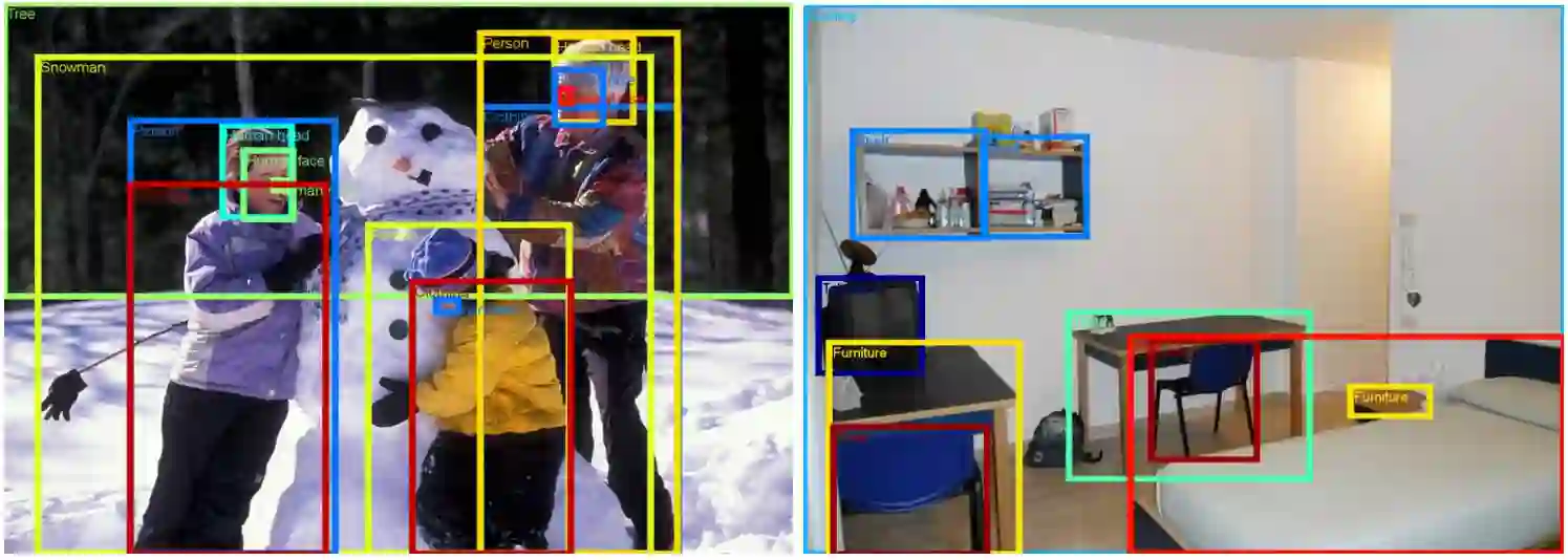 该数据集包含一个训练集(9011219张图像)、一个验证集(41620张图像)和一个测试集(125436张图像)。V1 版本里的验证集在 V2 版本中被划分为验证集和测试集,这样做是为了更好地进行评估。Open Images 中的所有图像都标注有图像级标签和边界框,如下图所示。