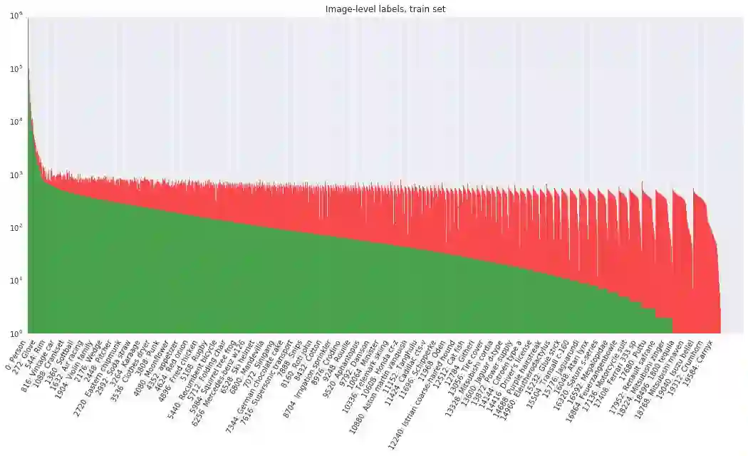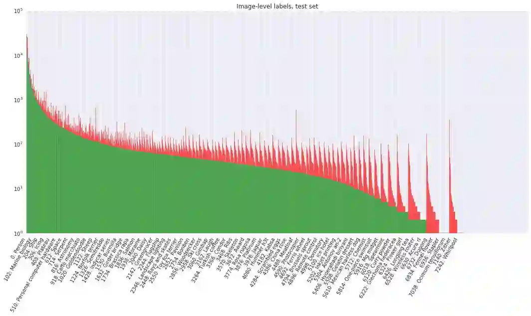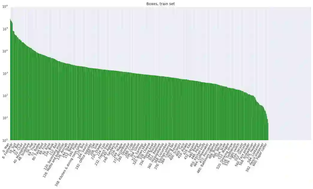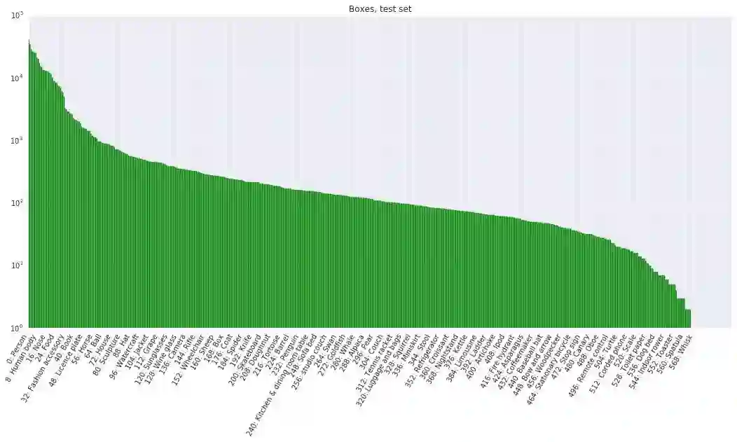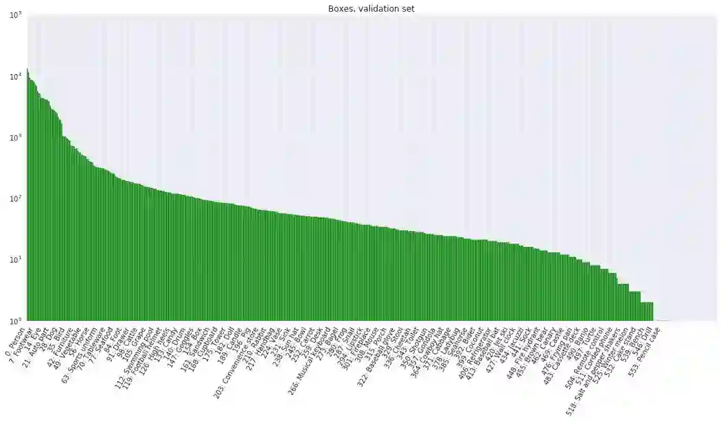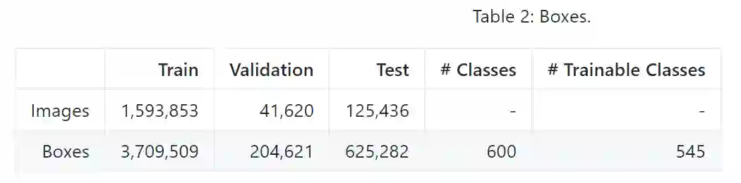 在训练集中,我们对 150 万张图像进行了边界框标注,并将带有最明确的肯定标签的图像作为重点标注对象。训练集中的每张图像平均大约有 2 个标注框。在整个训练集中,如果一张图像中包含多个属于同一类别的目标,通常只对一个目标进行边界框标注。