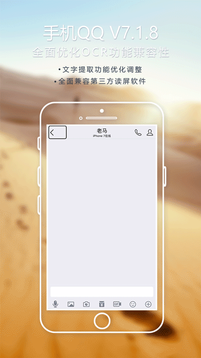 本次,手机QQ V 7.1.8基于文字提取功能进行无障碍沟通专项优化,提升了该功能与读屏软件兼容性,安卓用户安装第三方读屏软件,iOS用户在设置中开启VoiceOver功能,即可在手机QQ提取图中文字后获得文字内容的语音播报。此前,就有视障用户用手机QQ拍摄药瓶的照片,并语音转化提取出的文字,来了解药物功效和如何服用。本次优化对读屏软件的兼容性,更大范围提升用户获取信息的效率,同时为不便于阅读的用户和场景提供无障碍沟通能力,让更多视障用户可以通过该功能同步获取书面信息,旅行者也可以实时播报景点介绍文字等。