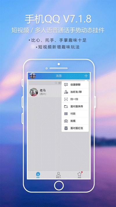 8月15日,手机QQ V7.1.8安卓版正式上线,在“文字提取”功能的基础上全面优化对读屏软件的兼容性,同时对视频聊天场景的互动体验进行优化调整,新增短视频手势动态挂件、热门图库短视频功能。手机QQ V7.1.8为用户创造高效便捷的聊天场景的同时,也满足年轻用户趣味和个性的需求。