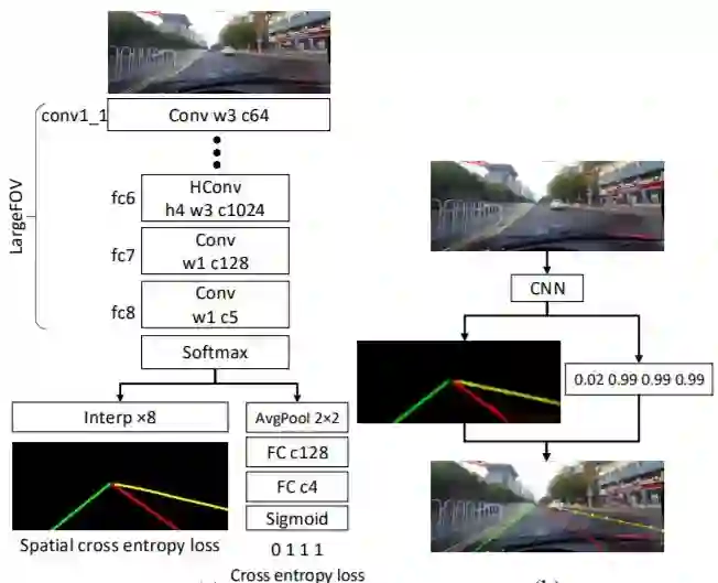 车道检测需要精确的像素识别和车道曲线预测。SCNN 的作者并未直接训练车道并进行聚类,而是先将蓝色、绿色、红色和黄色的车道分别标记为四类。模型针对每一条曲线输出了概率映射(probmaps),和语义分割任务相似,然后通过小型网络传递了 probmaps,并预测最终的 cubic spines。该模型基于 DeepLab-LargeFOV 模型的变体。