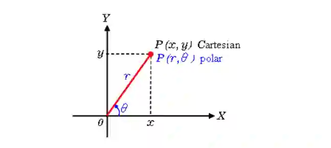 为了便于解释,我们用笛卡尔坐标来对应霍夫空间。但这种方法存在一个数学上的缺陷:当这条线垂直时,梯度是无穷大的,无法在霍夫空间中表示出来。为了解决这个问题,我们用极坐标代替。过程还是大致相同的,只是我们不在霍夫空间中绘制 b 对 m 的图,我们要绘制的是 r 对 θ 的图。