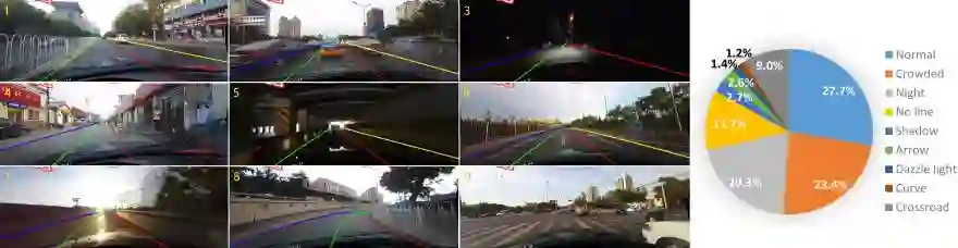 此外,除了 SCNN,作者还发布了 CULane 数据集,这是一个包括交通车道注释的大型数据集。CULane 数据集还包括许多极具挑战性的场景,包括遮挡情况和光照条件不同的情况。