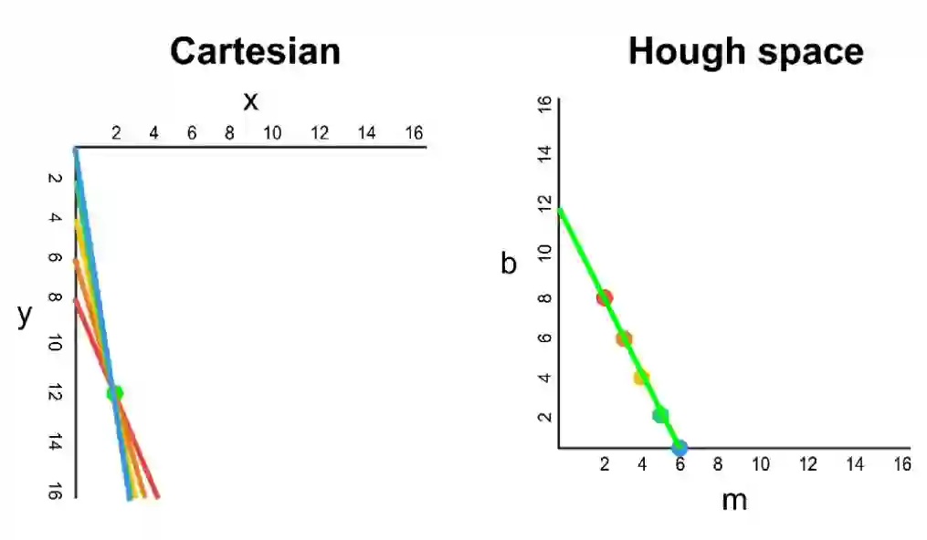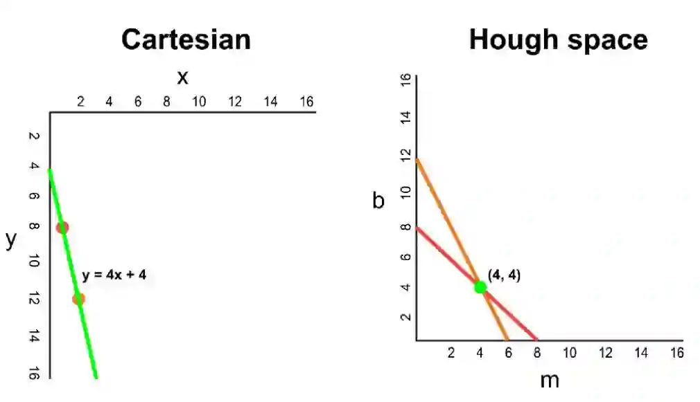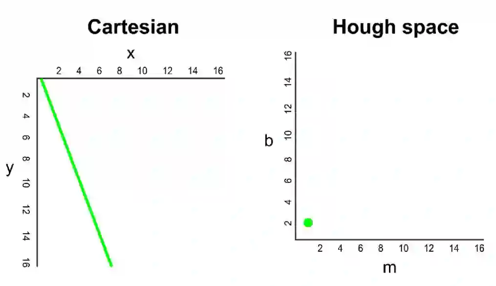 在笛卡尔坐标系中,我们可以通过绘制 y 对 x 的图像来表示 y=mx+b。但在霍夫空间中,我们也可以通过绘制 b 对 m 的图像将这条线表示为一个点。例如,直线方程 y=2x+1 在霍夫空间中可能是用 (2, 1) 表示的。