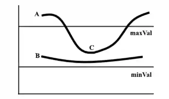 A 边高于 maxVal,所以是边。B 边在 maxVal 和 minVal 之间但没有和任何高于 maxVal 的边相连,所以删除。C 边在 maxVal 和 minVal 之间,且与 A 边(高于 maxVal)相连,所以是边。