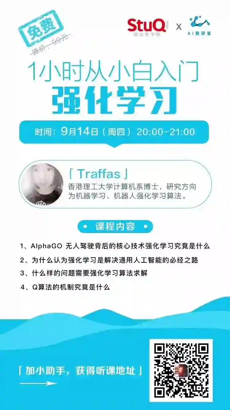 斯达克学院(StuQ)携手 AI 教研室(AI_classroom)共同为大家打造一系列深度强化学习公开课,第一讲内容我们邀请到香港理工大学计算机系博士—Traffas 为大家进行分享,我们会用一个小时的时间来带领大家理解什么是深度强化学习,培养解决大家的解决问题思路,知道什么问题需要强化学习的算法求解,透彻细致的讲解 Q 算法的机制,具体可参考海报。