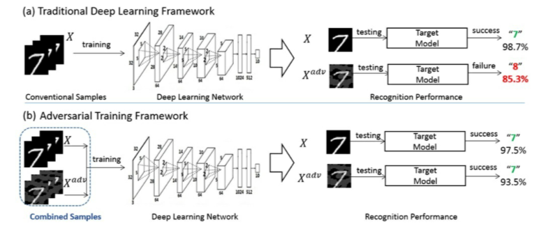 基于对抗训练的防御方法通常被认为是一种很简单粗暴的方法去防御对抗攻击。对抗训练的主要目的是通过在包含干净和对抗图像的数据集中训练,使分类模型更加健壮。