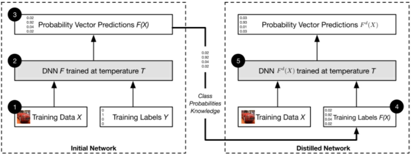 防御蒸馏是一种主动性防御。这个对策的灵感来自学习模型间知识转移的特性。在学习蒸馏中,复杂模型所获得的知识在使用确定的数据集进行训练后,被转移到更简单的模型上。