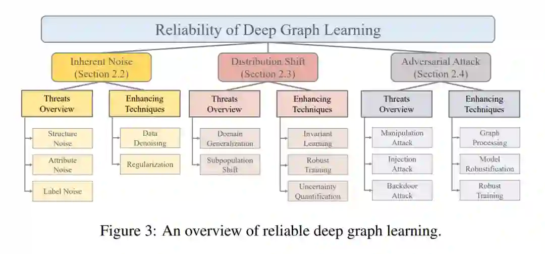 概述。在本文中,我们汇集了TwGL最先进和最重要的工作。本文的组织结构如下:在第2节中,我们全面回顾了针对三种威胁的可靠DGL的最新进展,包括固有噪声、分布转移和对抗性攻击。在第3节中,我们提供了最先进的GNN解释方法的详细技术概述。在第4节中,我们还讨论了DGL模型的隐私保护问题。对于每个部分,我们总结了未来研究的几个挑战和机遇。最后,我们在第5节中对可信图学习的进一步研究成果进行了总结。