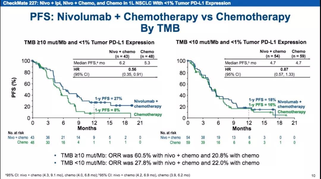 在这个研究中,还有一个最大的亮点是基于TMB分析,提供了IO 联合IO对比IO联合化疗在疗效方面比较的线索。我们来看CheckMate 227研究基于TMB分层的生存数据分析。同样是PD-L1<1%,在TMB< 10 mut/Mb亚组中,纳武利尤单抗联合化疗与单纯化疗组在ORR、PFS上均无统计学差异;但在TMB³ 10 mut/Mb亚组人群中,纳武利尤单抗联合化疗组的ORR达60.5%, 中位PFS达6.2个月,显著长于单纯化疗组。提示,TMB可能也可以作为IO联合化疗进行人群筛选的biomarker。