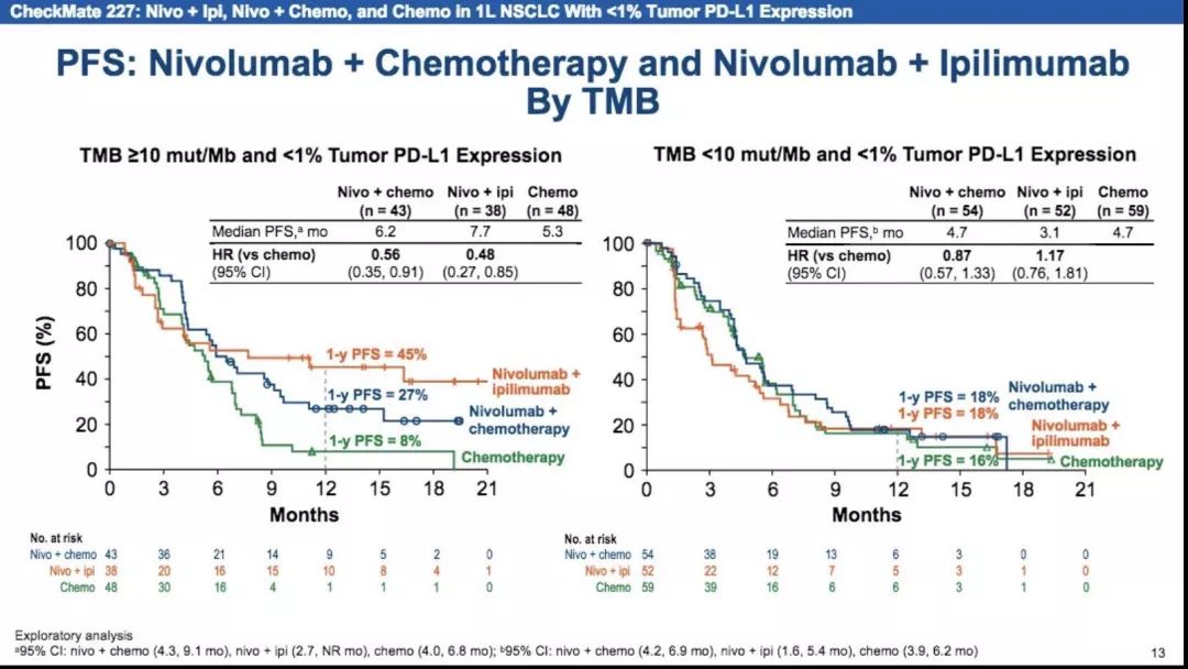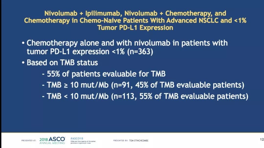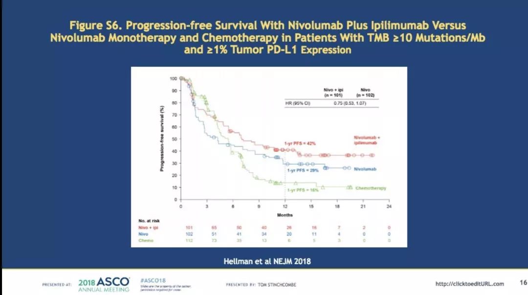 研究的1b部分,患者按照1:1:1随机分为三组:nivolumab (3mg/kg每两周给药)联合低剂量ipilimumab(1 mg/kg,每6周给药)组(n=187);nivolumab (360mg每三周给药)联合基于组织学类型选择的含铂双药化疗,加nivolumab单药维持治疗组(n=177);基于组织学类型选择的含铂双药化疗组(每3周,总共不超过4个周期,n=186)。在研究中使用经过验证的FoundationOne CDx检测TMB。