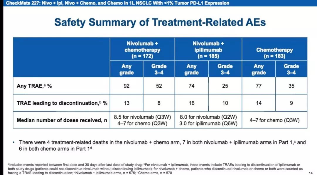 由于任何相关不良事件引起的终止治疗比例在nivo+chemo组和chemo组分别为13%和14%。