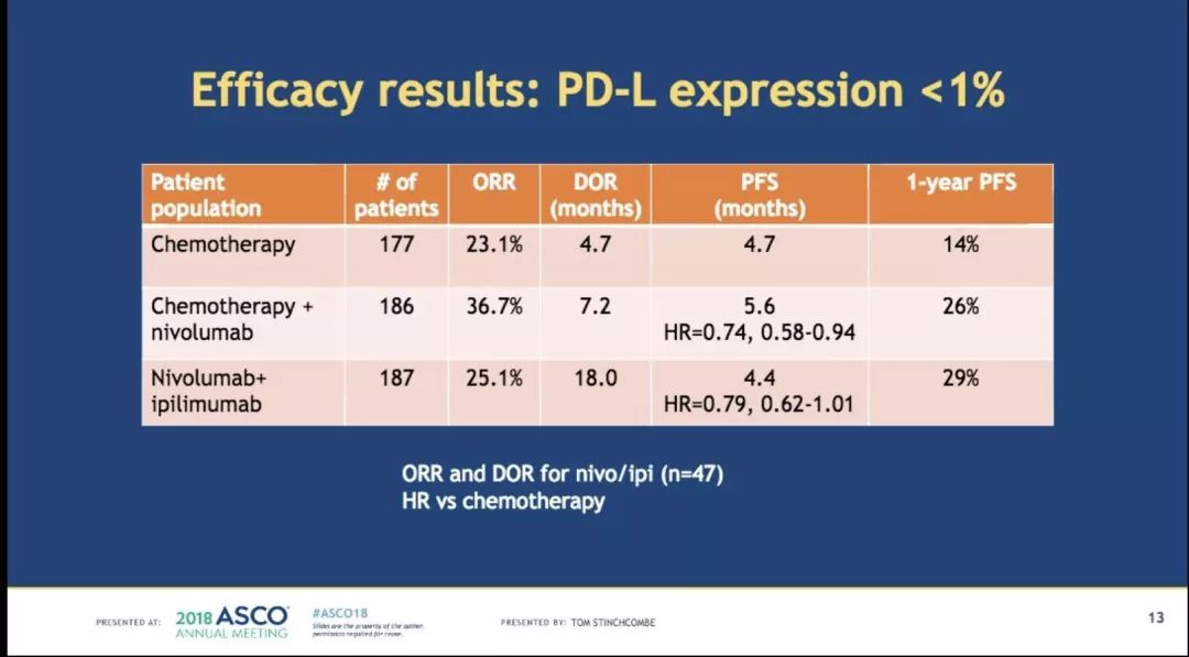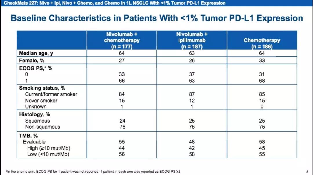Nivolumab+含铂化疗对比化疗在PD-L1表达<1%晚期NSCLC一线治疗结果-CheckMate 227 (ABS 9001)