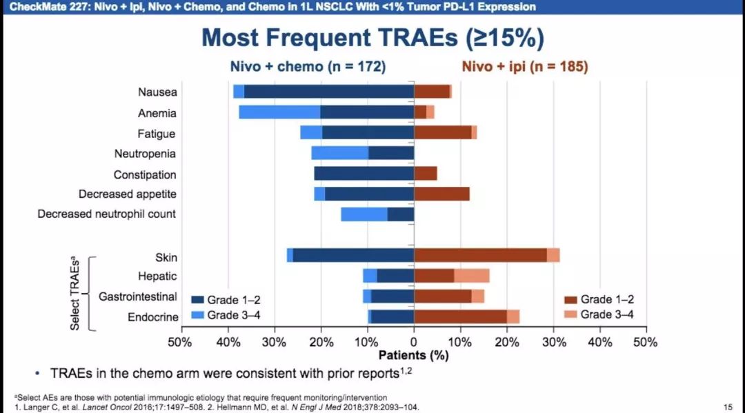 在这份报告中,接受nivolumab联合低剂量ipilimumab治疗的患者,有25%出现了3-4级治疗相关不良事件(TRAEs),nivolumab联合化疗组为52%,化疗组为35%。nivolumab联合低剂量ipilimumab组最常见的3-4级TRAEs为:肝损害(8%),胃肠道反应(3%),内分泌紊乱(3%),皮肤问题(3%),腹泻(2%),贫血(2%),疲劳(1%),乏力(1%)和恶心(1%)。nivolumab联合化疗组最常见的3-4级TRAEs为:贫血(17%),中性粒细胞减少(12%),白细胞计数减少(10%),疲劳(5%),肝损害(3%),食欲下降(2%),恶心(2%),胃肠道反应(2%),腹泻(1%),皮肤问题(1%)和内分泌紊乱(0.6%)。