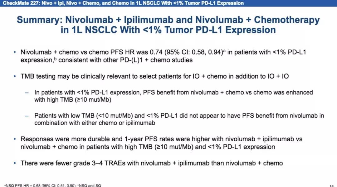 总的来说,CheckMate 227研究的目前数据可以支持TMB³10 mut /Mb作为生物标记物指导人群筛选和免疫治疗。但问题在于,对于TMB³10 mut /Mb的患者,IO联合IO治疗已经与IO联合化疗还是IO单药我们如何做更优的选择。
