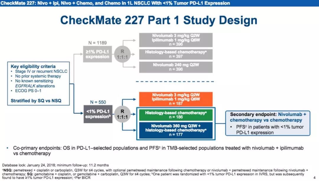 CheckMate-227是一项开放性III期临床研究,评估了基于nivolumab的治疗方案与含铂双药化疗用于晚期非小细胞肺癌(NSCLC)患者(包括鳞癌和非鳞癌患者)一线治疗的疗效和安全性。该研究共分为下列3个部分: