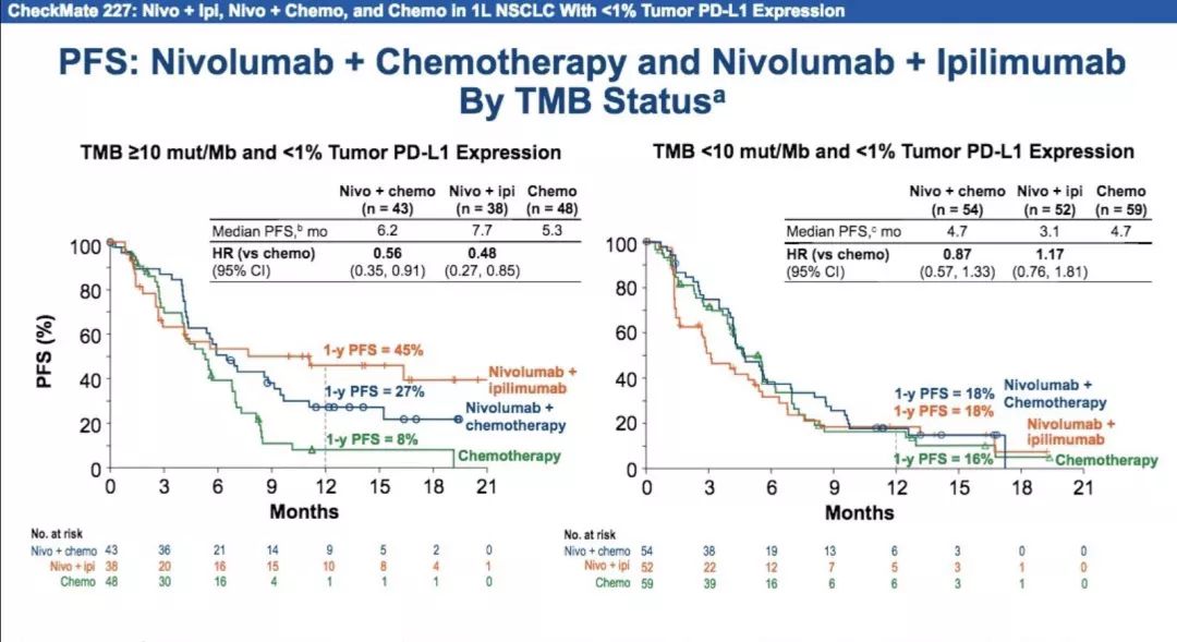 同样地,此次汇报的CheckMate 227研究结果显示,3个治疗组在PD-L1 < 1%、TMB³ 10 mut /Mb人群中的PFS获益分布与上述TMB³ 10 mut /Mb人群中极为相似,即IO联合IO对比IO联合化疗,延长PFS。当然,在这样的人群中,关于IO联合IO是否由于IO联合化疗,期待更多的证据。