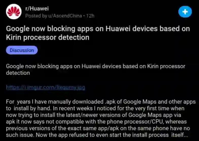近日,Reddit有网友称,自己的华为手机无法再手动安装谷歌GMS了,而错误提示都是「跟设备的CPU不兼容」,引发了谷歌正在彻底封杀麒麟芯片的猜疑,但是最新的信息显示,这只是个例,华为智能设备仍可安装谷歌应用。