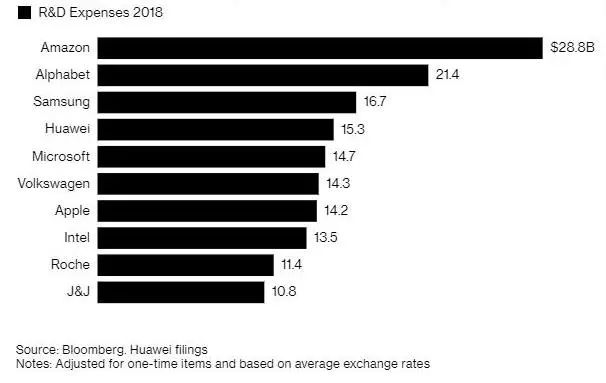 彭博数据显示,华为2018年研发支出预算位列全球第四,仅次于亚马逊、Alphabet和三星电子,超过微软、苹果、Intel等业内巨头。