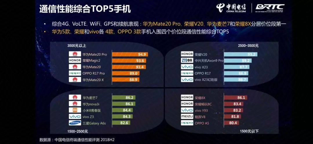 据悉,该排行数据源自《中国电信终端通信性能评测2018H2》,这是中国电信移动终端研究测试中心于2018年9月份发布的一份研究报告。