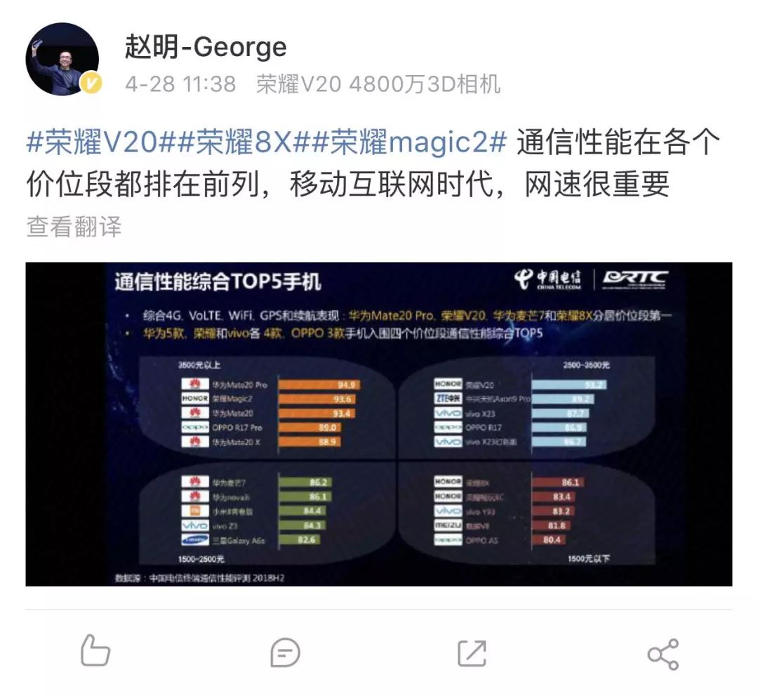 今天,荣耀总裁赵明发布了一份排行榜,排行榜显示荣耀机型在各个价位的通信性能都名列前茅。