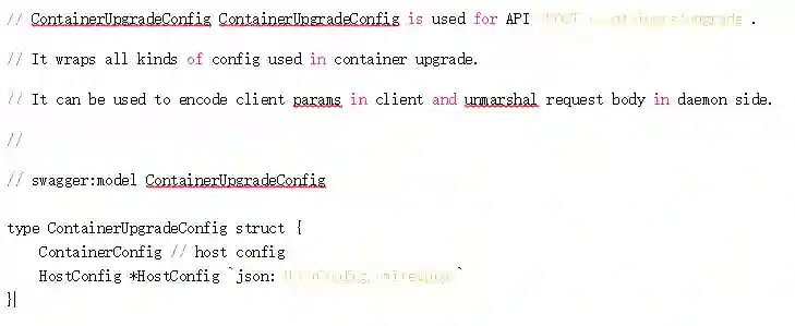 首先说明一下 upgrade API 入口层定义,用于定义升级操作可以对容器的哪些参数进行修改。如下 ContainerUpgradeConfig 的定义,容器升级操作可以对容器 ContainerConfig 和 HostConfig 都可以进行操作,如果在 PouchContainer github 代码仓库的 apis/types 目录下参看这两个参数的定义,可以发现实际上,upgrade 操作可以修改旧容器的__所有__相关配置。