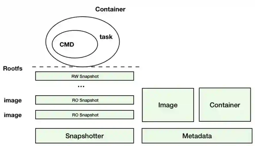 PouchContainer 中没有了 GraphDriver 和 Layer 的概念,新的存储架构里引入了 Snapshotter 和 Snapshot,从而更加拥抱 CNCF 项目 containerd 的架构设计。Snapshotter 可以理解为存储驱动,比如 overlay、devicemapper、btrfs 等。Snapshot 为镜像快照,分为两种:一种只读的,即容器镜像的每一层只读数据;一种为可读写的,即容器可读写层,所有容器增量数据都会存储在可读写 Snapshot 中;