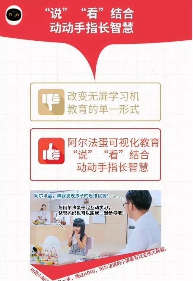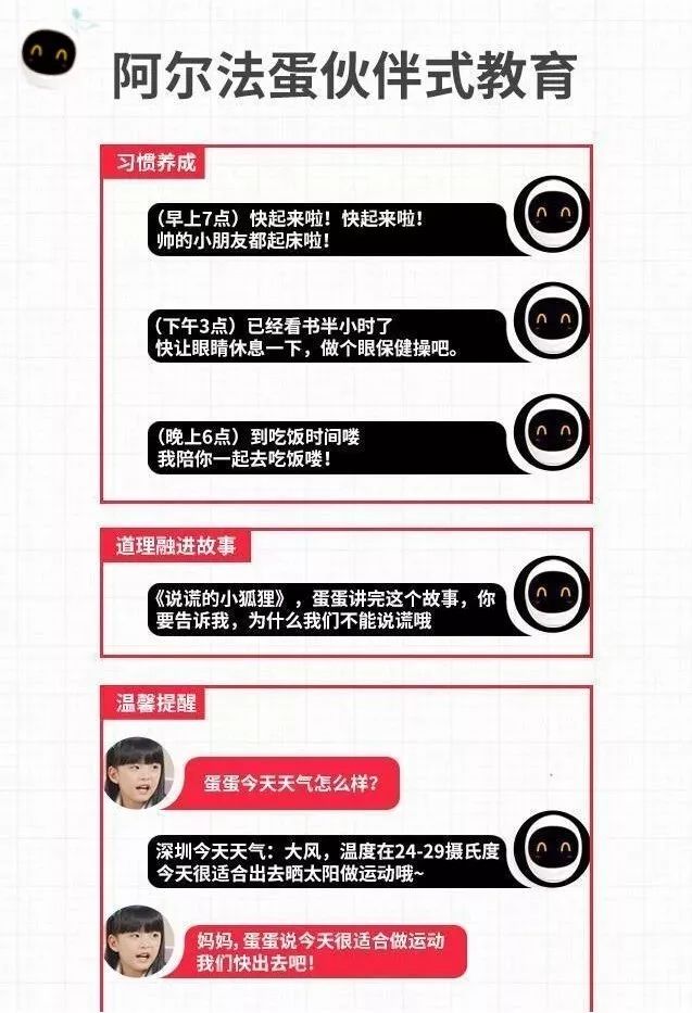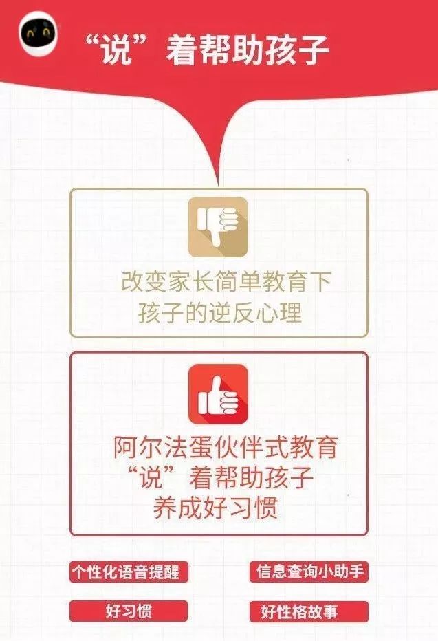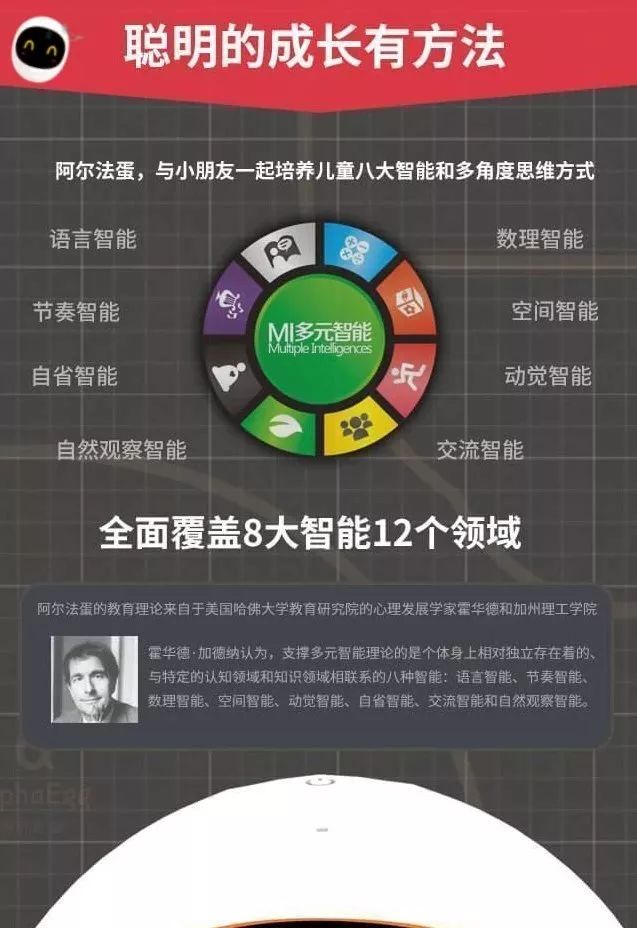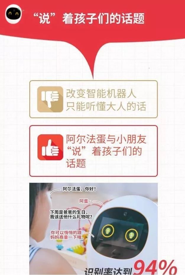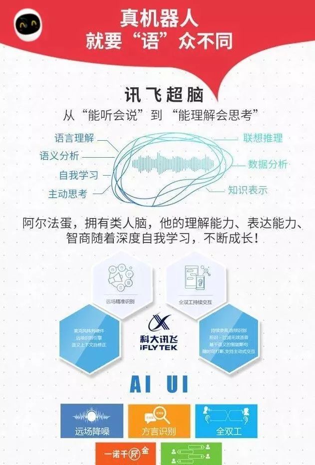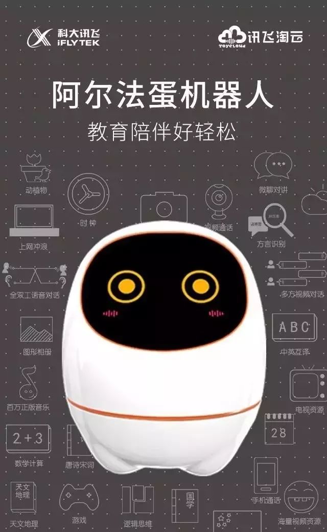 阿尔法蛋智能机器人,是一款集成教育内容、超级电视、视频通话、智能音箱和自然语交互于一身的功能聚合式教育陪伴智能机器人,功能与服务面及家庭所有成员。聚合如此强大功能的阿尔法蛋智能机器人基于科大讯飞人工智能技术,搭载讯飞淘云TY OS智能系统,拥有“类人脑”,其理解能力、表达能力、智商都会随着深度自我学习,不断成长,是一款“真”机器人!另外,别小看这个阿尔法蛋,它可是大有来头。在2017年3月时它还获得了有“产品设计奥斯卡”之称的“iF国际设计奖”呢。看一下视频的详细介绍吧。