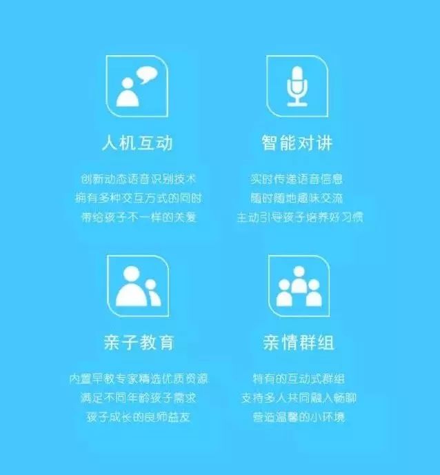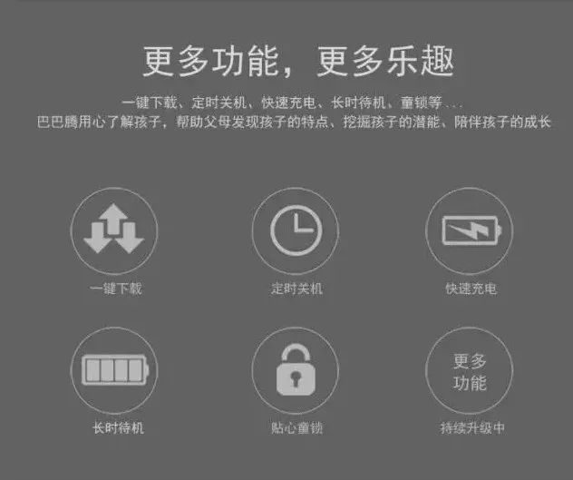 巴巴腾拥有人机互动、智能对讲、亲子教育、亲情群组、英汉互译、食品级外壳、科大讯飞语音和超多丰富资源。还和贝瓦儿歌、百度百科、十万个为什么等超多丰富资源合作,为孩子提供丰富而益智的选择;内置早教专家精选优质资源,满足不同孩子的年龄需求;实时传递语音信息,随时随地的趣味交流,主动引导孩子,培养良好习惯;持有的互动式群组,支持多人共同融入畅聊,营造温馨的小环境;食品级ABS+TPU外壳,安全放心,再也不怕宝宝咬玩具了;LED曲面点阵光源,均匀柔光不刺眼,贴心保护孩子的视力……是孩子成长的良师益友!